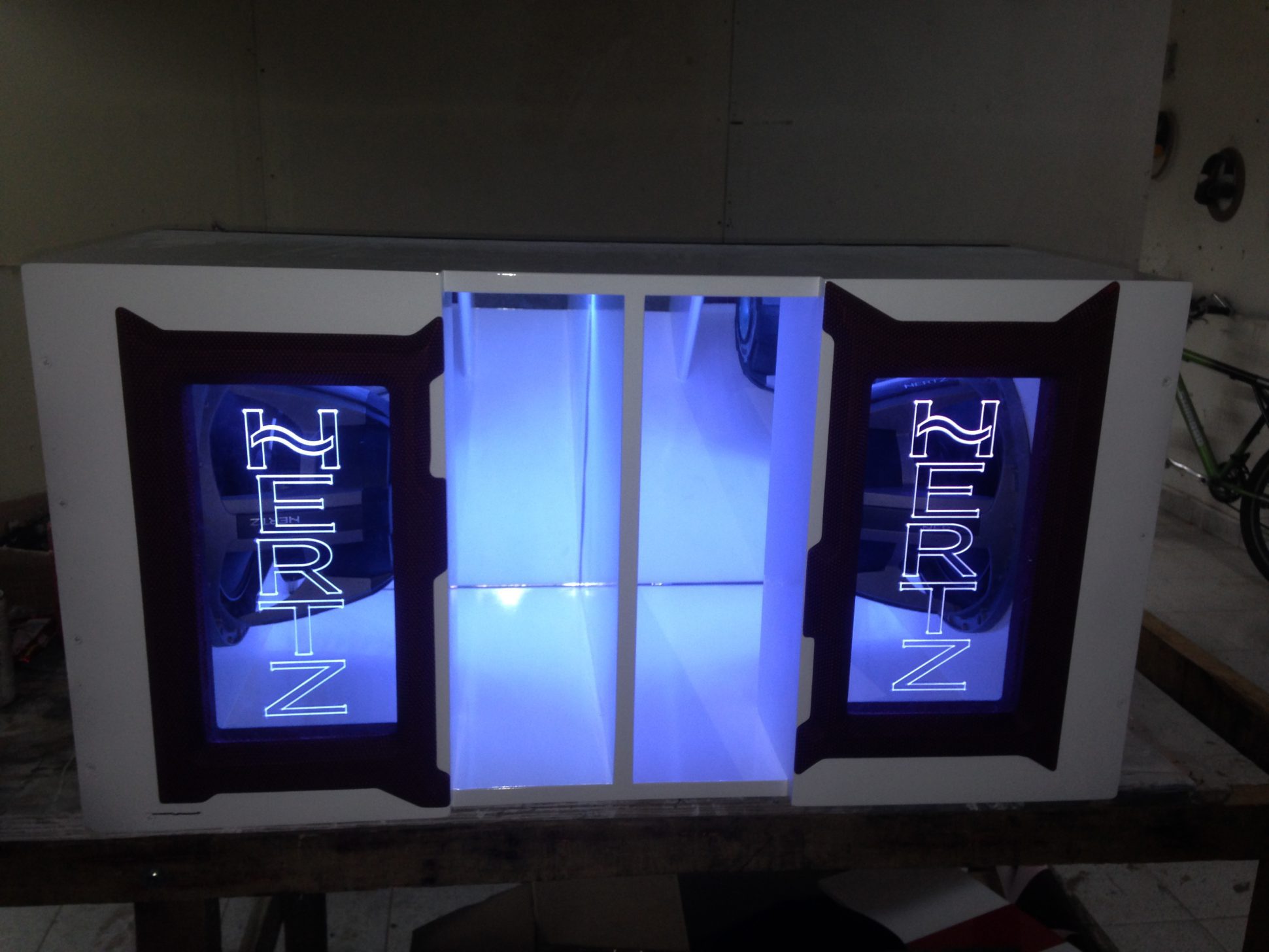 Cajas construidas, diseñadas y cubicadas para trabajo de alta presión como son los requerimientos en las competencias de Car Audio, caja acústica especialmente diseñada 2 subwoofer HERTZ, ventilada o con porto para mayor profundidad en la frecuencia subgrave, pintura en poliuretano y tapizada en materiales sintéticos de alta calidad, además su estilo muy original cuenta con un acrílico en la parte frontal de color blanco y luz led azul para producir una bonita y fuerte luz durante la reproducción del sonido en la caja.