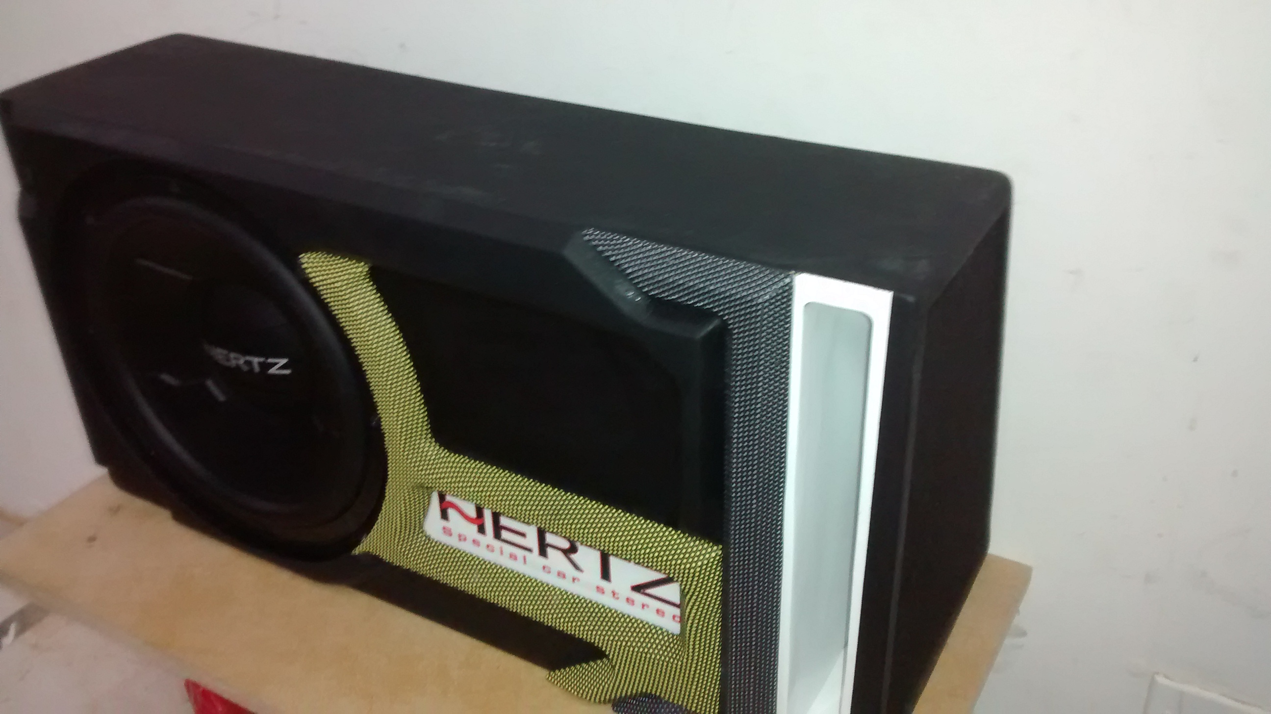 Bajos de competencia Herzt de 1000 watios, Caja acústica con desfogue para altavoces, ajustable a su automóvil, completamente hermética y sellada, para subwoofer de 10″ o 12″ pulgadas, pintura poliuretano tapizado en vinicuero en dos colores, útil para sonido externo.