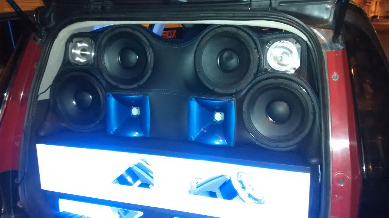 Montaje de Sonido exclusivo para carros Chevrolet Aveo, se compone de una caja acústica tipo turbo pasa banda de dos subwoofer de 12″ Hertz, con desfogue en la parte frontal para un mejor sonido del subwoofer, tapizado en vinil cuero negro y blanco con acabados de pintura de poliuretano negra y blanca, y con un acrílico resistente, también incluye una palomera con cuatro medios de 8″, dos cornetas y dos tweeters de 4″, tapizada en vinil cuero negro, con acabados de pintura de poliuretano negro, para aumentar la elegancia y estética del montaje, a su vez logrando un montaje con potencia y calidad de sonido.